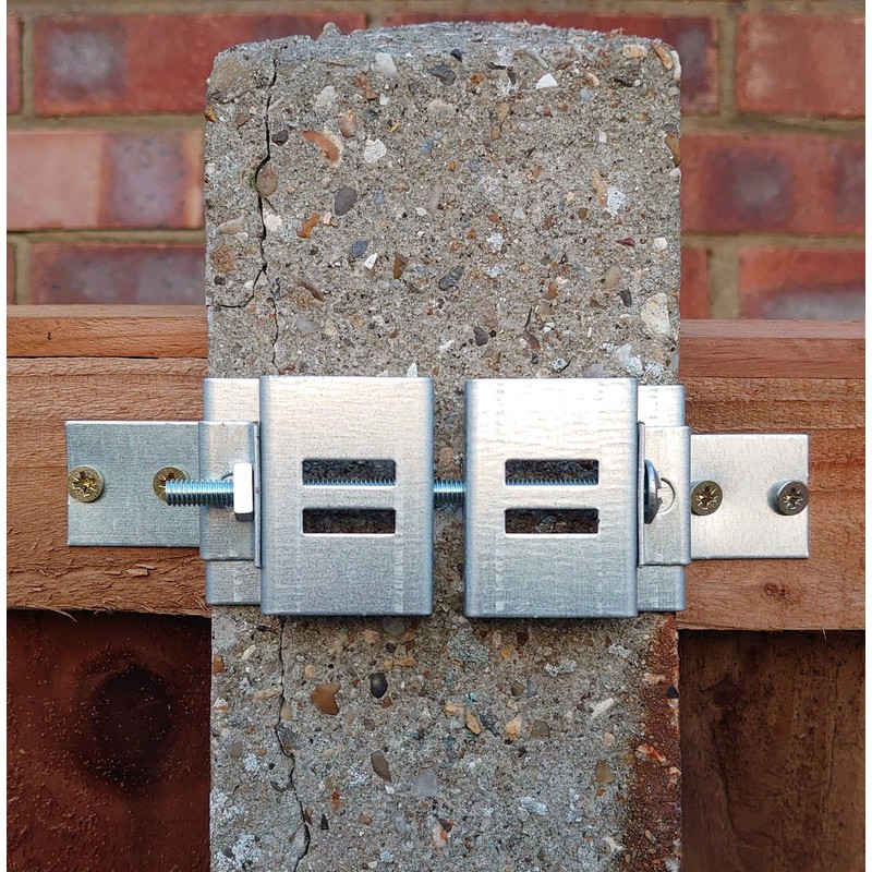 Postfix 4 x 4 Post Security Brackets prevent fence panel removal and rattling! PACK CONTENTS - 2 - MAIN POSTIX brackets that fit 4" x 4" Slotted Concrete Posts (4 HALVES), 2 - Fixing Bolts that run through the two halves and 4 - Security Clips that fit snugly beneath the fixing bolts. **NO SCREWS or HANGING BASKETS INCLUDED IN PACK.** Once clamped on they do not slide down the post! **IMPORTANT NOTE ON SIZE** Designed to fit 4" x 4" Slotted Fence posts, 90 - 116mm wide, with measurement from the slot to the front of the post of less than 29mm. Add our POSTFIX PF10 Adaptor Brackets to hang hanging baskets from them, see our PF10 listing.