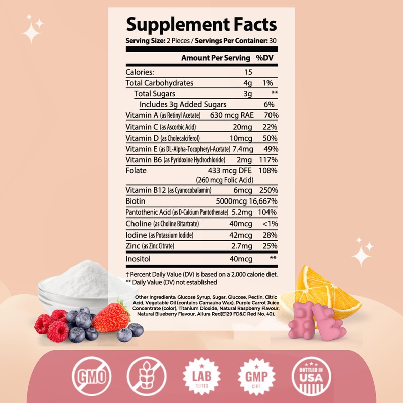 - Essential Support for New Moms: Beyond Biotin, our gummy vitamins for women pack Folic Acid, Zinc, Choline, Vitamins A, C, D, E, B6, B12, Iodine, Inositol, and more, aiding recovery and wellness