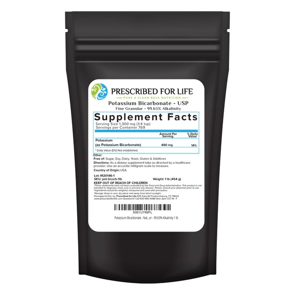- PREMIUM BULK NUTRITION: Prescribed for Life offer sizes from 0.5 oz to 25 kg (55 lbs) for your bulk potassium bicarbonate needs. Our potassium bicarbonate powder is packaged in the USA in accordance with GMP guidelines.