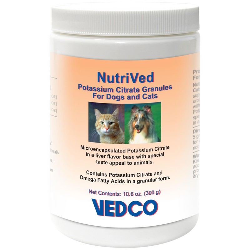 - For supplementation of the diet to aid in prophylaxis of urinary stone formation in cats and dogs. Vedco Microencapsulated Potassium Citrate Granules help decrease the possibility of calcium oxalate stone formation.