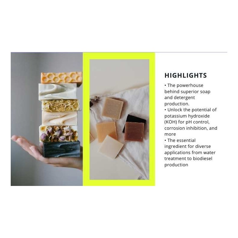 - Maximize Efficiency and Performance: Leverage the potency of potassium hydroxide to enhance your production processes. Ideal for industries ranging from soap manufacturing to biofuel production, KOH flakes offer superior solubility and reactivity. Optimize your operations by integrating this high-quality chemical into your workflow for improved results and efficiency.