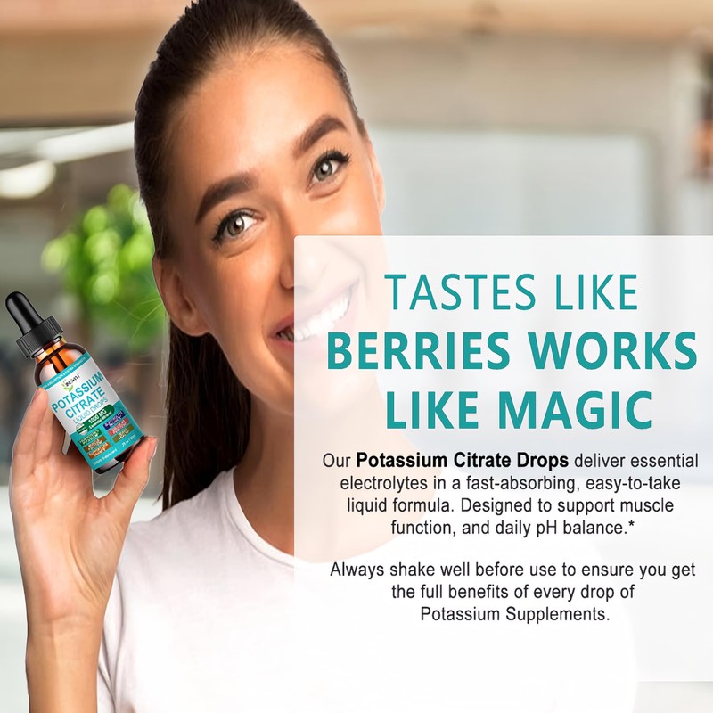 - WHY OUR POTASSIUM CITRATE SUPPLEMENT? Support your electrolyte balance, muscle function, and pH health with our high-potency Potassium Citrate Liquid Drops—delivering 1000mg of potassium in a fast-absorbing, easy-to-take formula. Designed for women and men seeking clean, plant-based support, our liquid potassium promotes healthy hydration, and kidney wellness.* With no fillers or artificial additives, it’s a convenient way to help maintain key mineral levels and support your active lifestyle.*