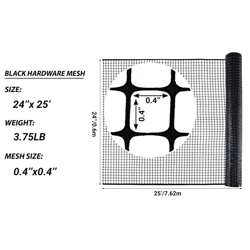 PotatoLife Plastic Hardware Mesh Netting, Temporary Fence, Tree Guards, Staircase Banister, Animal Barrier, Garden Netting, Poultry, with 50 Zip Ties (Black, 24'' x 25')