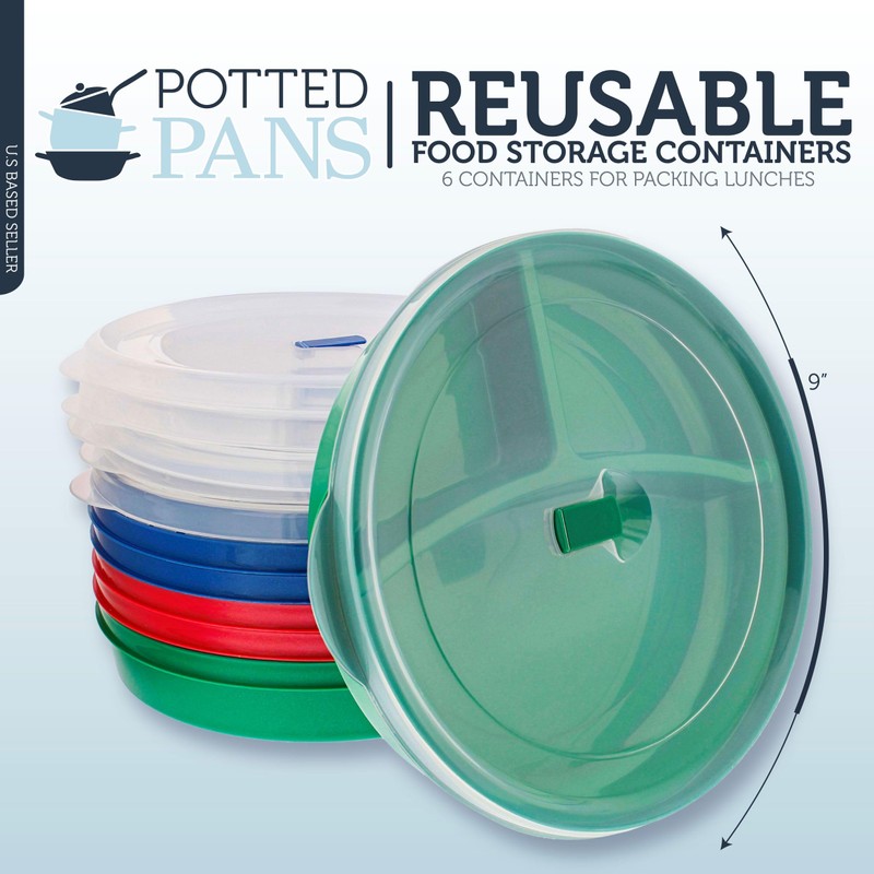 Potted Pans Plastic Food Storage Containers with Lids - 6pk 3 Compartment Meal Prep Containers Reusable Lunch Boxes