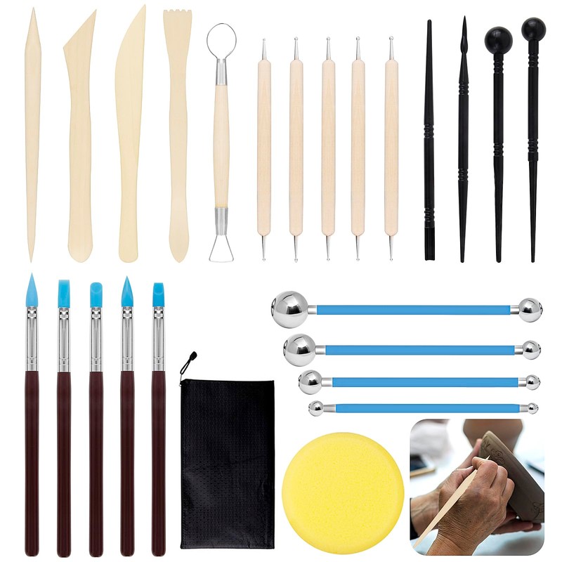 - 25-piece clay tool set: the package contains a total of 25 potters set for beginners. 5 x brown clay silicone pens; 5 x wooden clay sculpture tools; 5 x wooden pens with two metal tips on the ends, 4 x black plastic ball and tip tools; 4 x blue metal dotting tools with rubber handle; 1 x ceramic sponge and 1 x carry bag for clay tools. 24 pieces different polymer clay tools to meet your needs in the ceramic class, sculpture learning class and DIY handmade, etc.