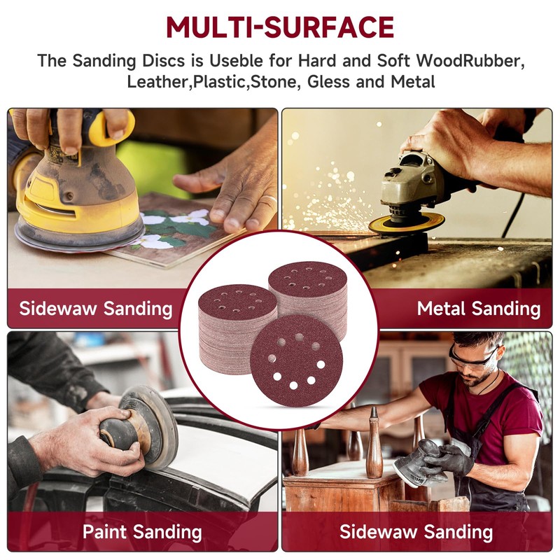 - 【Strong Adhesion】This set of 100 pcs, sanding discs 5 inch 8 hole, features a thickened hook and loop sandpaper back that adheres well to random orbital sanders and has twice the adhesion of regular sandpaper.