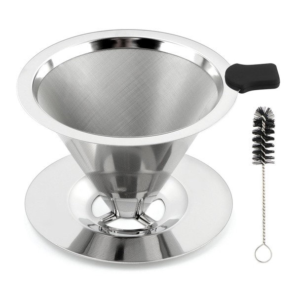 Pour Over Coffee Dripper, Stainless Steel Cone Coffee Filter with Base, Dual-Layer Fine Mesh Coffe Filter, Paperless Reusable Cone Coffee' Maker Dripper with Cleaning Brush(SIZE:M)