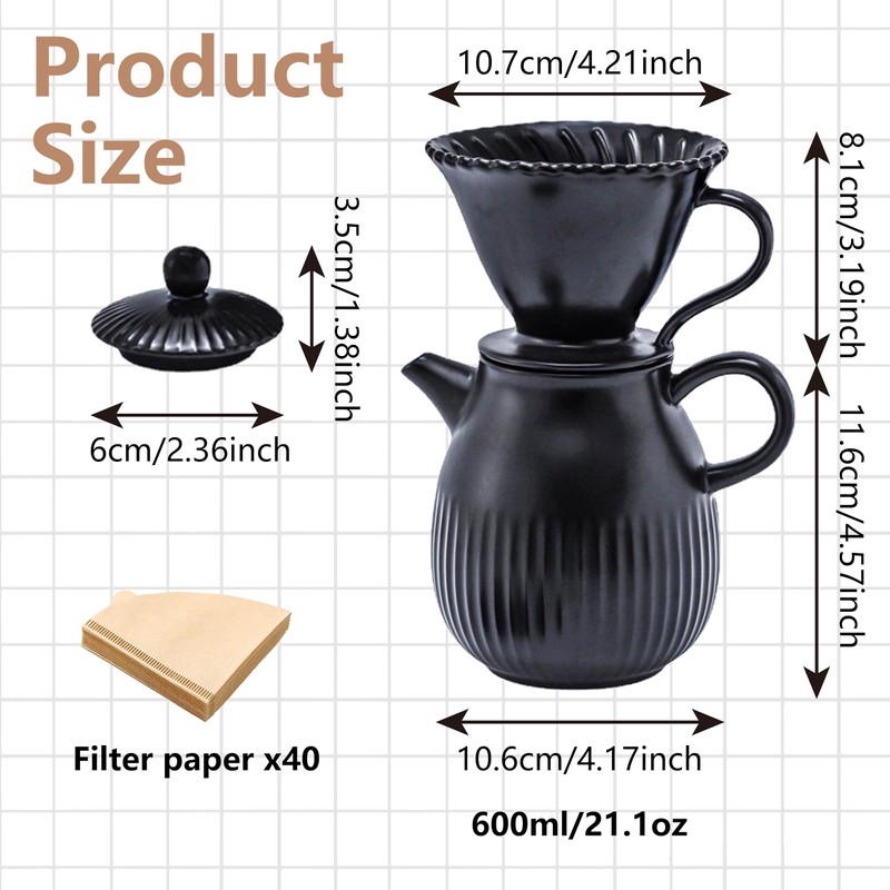 - Size:This ceramic coffee filter set boasts a generous 600ml/21oz capacity, making it perfect for brewing coffee for two to three people