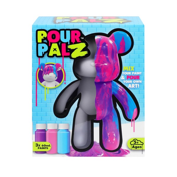 - 1 x posable Pour PalZ Large Paint Bear, 1 x mixing cup, 1 x pour spoon, 1 x set of gloves, 1 x apron, 1 x no mess clean sheet, 1 x easy to follow instruction sheet and 3 x 60mL acrylic paints.