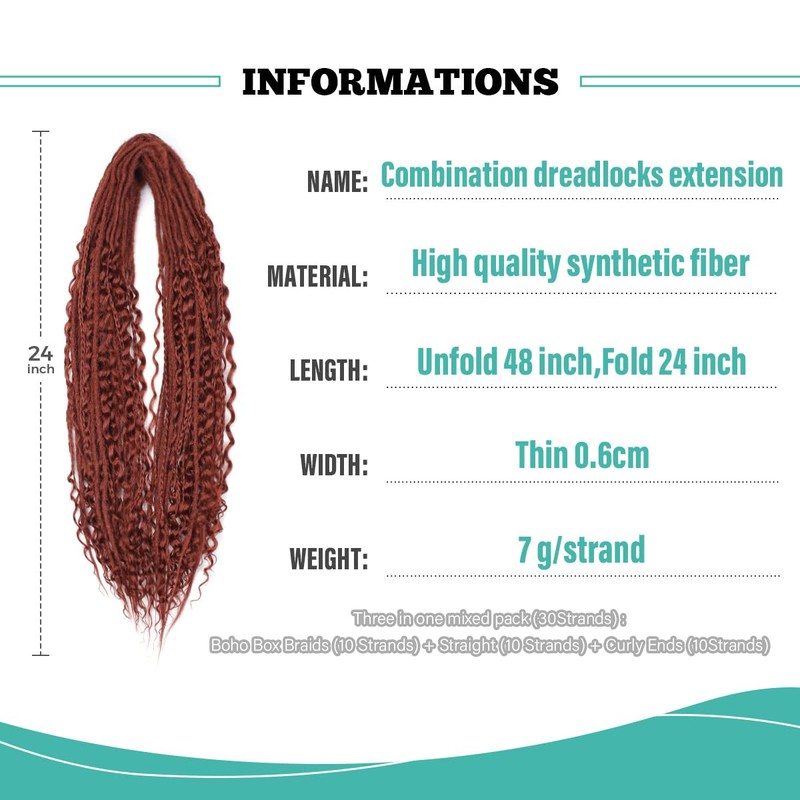 Pouweney 24 Inch 3 In 1 DE Dreadlock Extensions Sets, 30 Strands Mixed Copper Red Synthetic DE Dreads Extensions, 100% Handmade Soft Double Ended Curly Boho Wavy Dreads for Girls