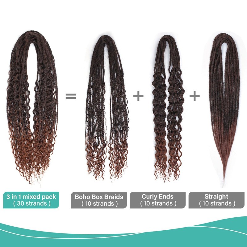 Pouweney 24 Inch 3 In 1 Dreadlock Extensions Sets, 30 Strands Mixed Ombre Auburn Synthetic DE Dreads Extensions, 100% Handmade Soft Double Ended Curly Boho Wavy Dreads for Girls