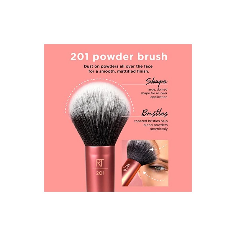 - Diseñado por maquilladores, el cepillo de polvo Real Techniques te ayudará a crear un acabado impecable una y otra vez. Son ideales para polvos y maquillaje mineral, pero las fibras suaves son compatibles con una gama de productos y te darán una cobertura de alta definición que resistirá cualquier tipo de iluminación. Los cepillos están hechos con cerdas sintéticas cortadas a mano y vienen con un tutorial en línea para ayudarte a crear un aspecto profesional que te encantará. Para obtener los mejores resultados, limpia semanalmente con nuestro gel limpiador de cepillo. El aspecto genial comienza con una base impecable. Aplica uniformemente polvos y bases minerales para obtener resultados suaves y de alta definición. Real Techniques es una de las primeras marcas en traer herramientas innovadoras de calidad de prestigio, galardonadas y a un gran valor para la belleza obsesionada en todo el mundo. Desde 2011, hemos estado creando herramientas y accesorios para ayudar a aprovechar al máximo tu maquillaje favorito. Con una comunidad de belleza de más de 5 millones, Real Techniques se esfuerza por inspirar, educar y empoderar a nuestros fans para que aprovechen al máximo sus productos favoritos. Ya sea que estés luchando por tu mejor aspecto sin maquillaje o a punto de hacer tu debut en la pasarela, Real Techniques tiene la herramienta perfecta para ti. Nuestros pinceles llevan tu aspecto al siguiente nivel con nuestros pinceles y juegos de pinceles individuales. Desde la base hasta la sombra de ojos y desde el rubor crema hasta el polvo fijador, acentúa tus características favoritas. Nuestros pinceles ligeros, de calidad de prestigio, fáciles de usar y fáciles de limpiar te ayudan a crear contornos definidos, construir cobertura y capas en tus mejores looks de maquillaje. Nuestras esponjas optimizan tu rutina de belleza con nuestras versátiles esponjas de maquillaje, diseñadas con una revolucionaria tecnología de espuma sin látex para mezclar uniformemente el maquillaje para un acabado suave y mejorado. Nuestras esponjas milagrosas se pueden utilizar húmedas o secas. Como los fabricantes de la esponja de maquillaje #1