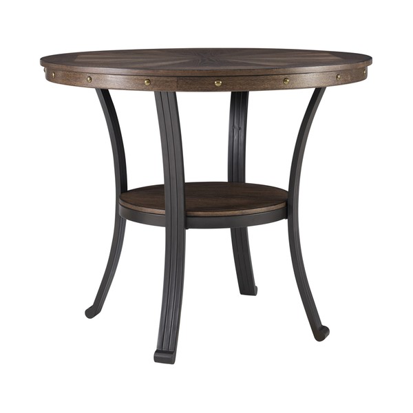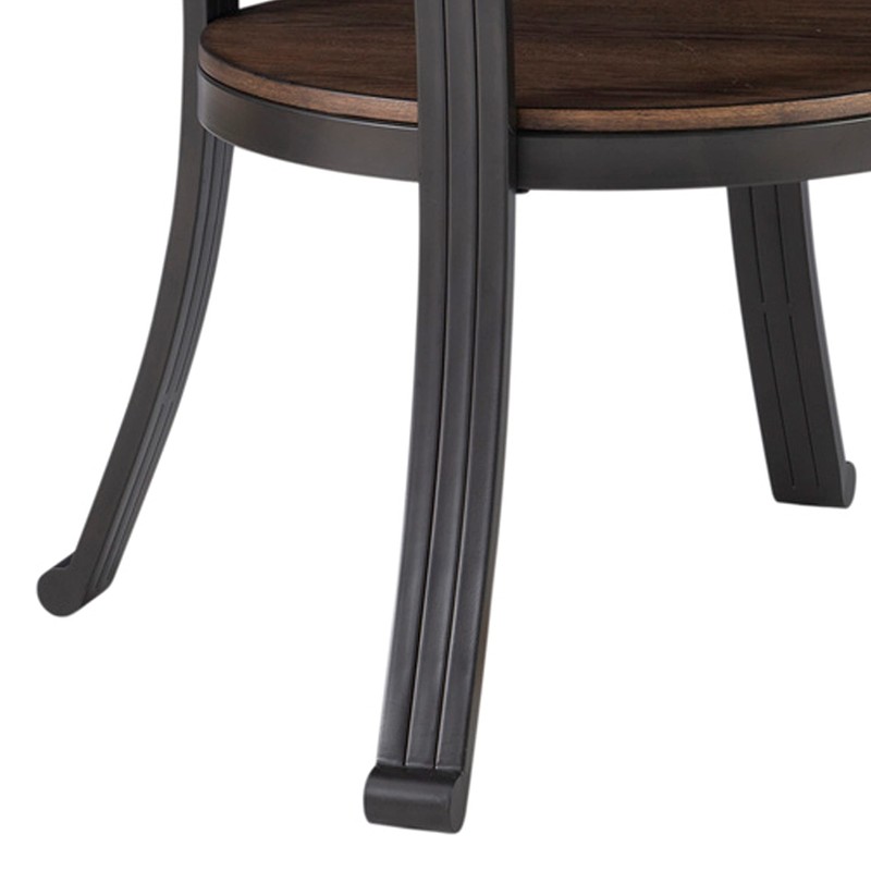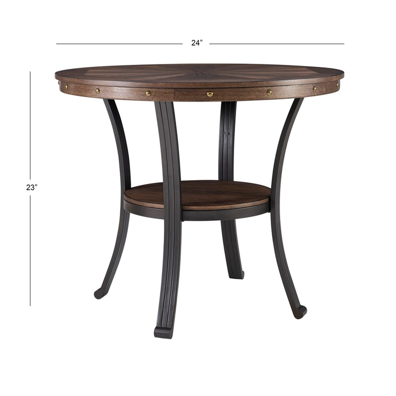 Mixing metal with wood, the transitional Franklin side table provides a unique addition to your home. The round table features an oak woodgrain veneer with nail heads along the apron. The sturdy metal base is made of curved legs and includes a Small circular shelf. Some assembly required.