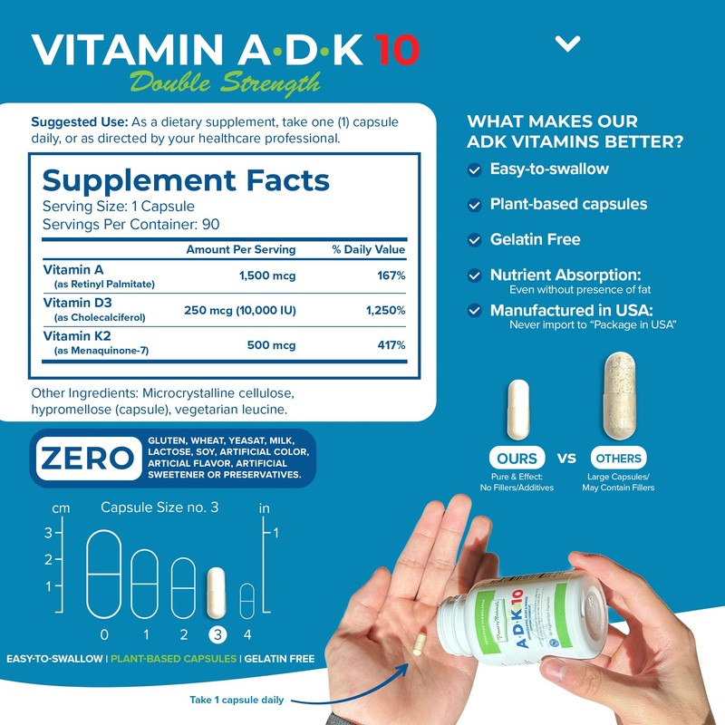 - ✔️ Powerful & Double Strength - Vitamin Bone Support in One Small Vegetarian Vitamin ADK Capsule = Vitamin A 5,000 IU + Vitamin D3 10000 IU + K2 Vitamin (as MK-7) 500 mcg) for Bone Structure Support, Strong immune system, Helps Lower Cholesterol and Calcium Absorption.*