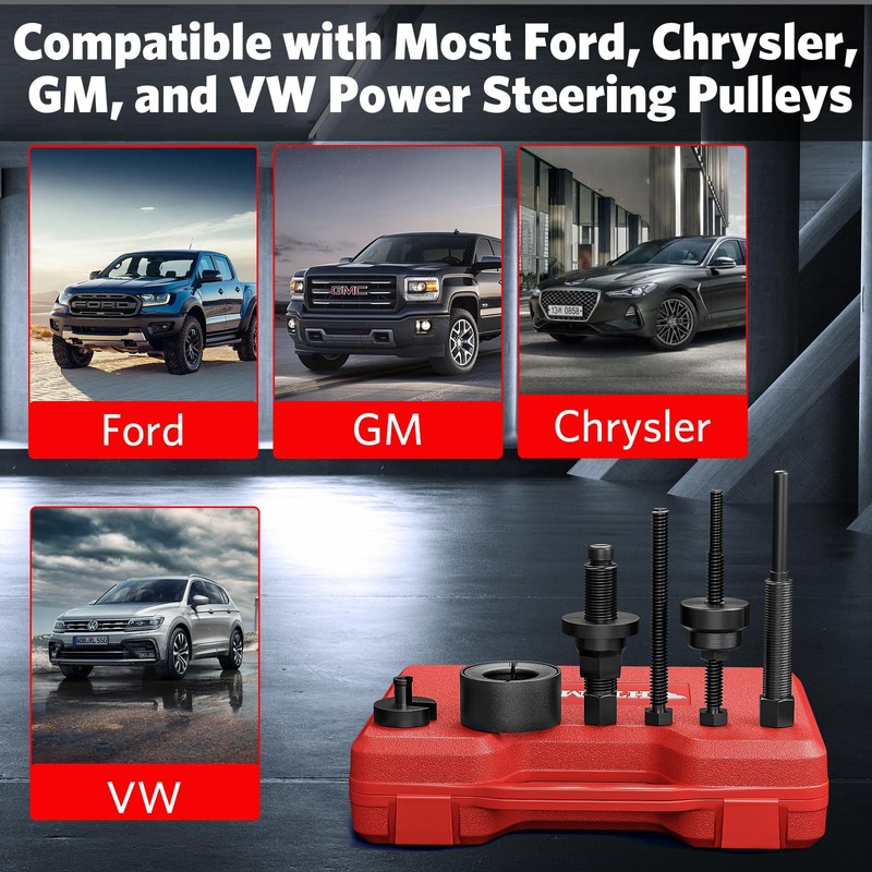 HTOMT Power Steering Pump Pulley Removal Tool,Power Steering Pulley Puller/Installer Tool Set,Pump Pulley Puller Remover and Installer Set Tools Compatible with Ford, GM, VW and Chrysler Vehicles-Red