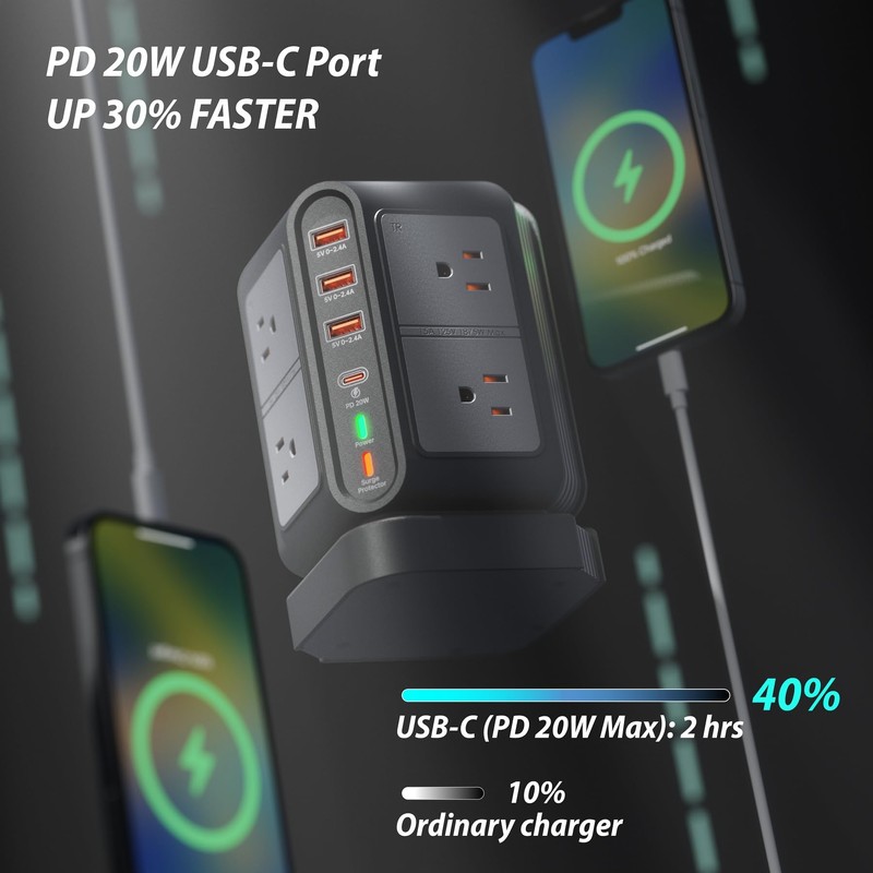 A portable vertical power strip tower integrated with 12 multiple charging outlets totally,include 8 AC standard outlets and 3 USB-A ports,1 PD20W fast charging USB-C port,well-proportioned size similar with a smart phone won't take too much tabletop space.At the same time,it can almost meets your needs for charging phones,bluetooth earphones,watches,tablets and other smart devices.It suitable be used in kitchen,nightstand,computer desk or any other spaces of your living room,bedroom,dormitory,office meeting room etc.Best one-stop charging solution. Anyway,you can try with amazing power strip.