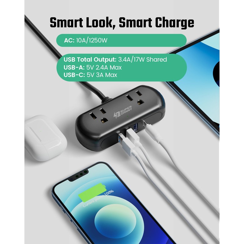 - 【Smart USB Charging】4 smart USB ports on this multiple port power bar can intelligently detect your phones, smart watches, tablets, kindles, lamps, and other electronic devices to charge them at the fastest possible yet safe speed up to 2.4A per port, 3.4A in total.