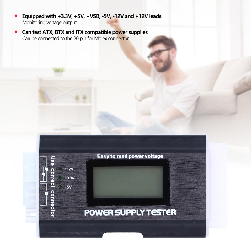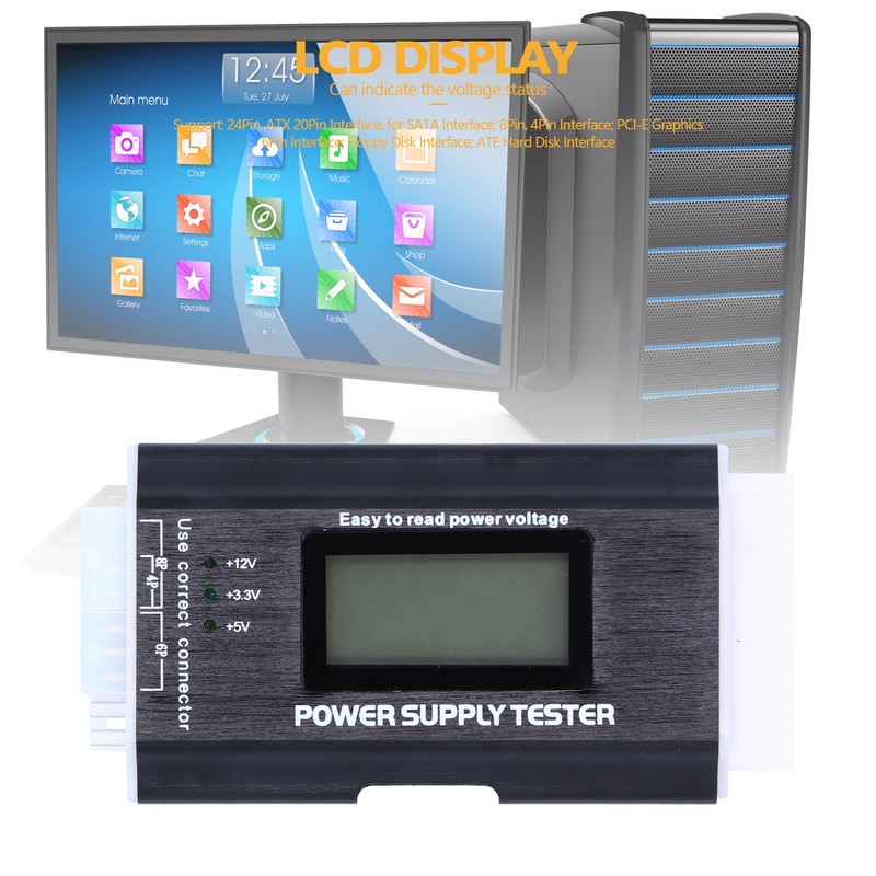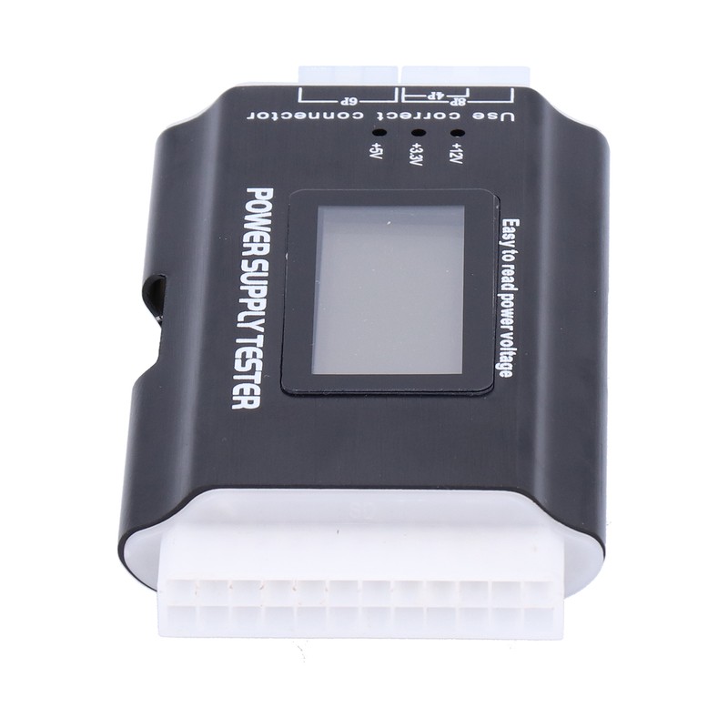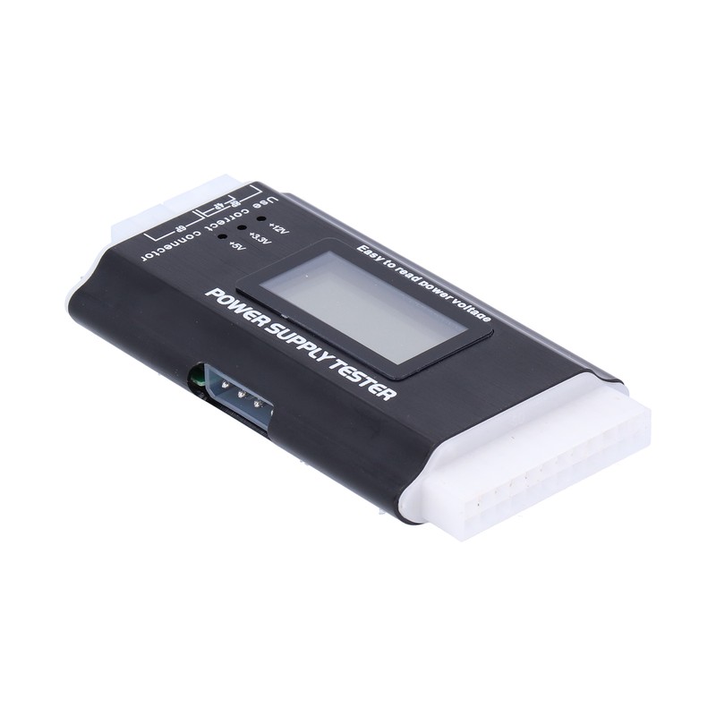 1、Power tester is a rugged voltage tester for PC power supplies, it can test ATX, BTX and ITX compatible power supplies. 2、LCD display can indicate the voltage status, it's quick and convenient for you to check. 3、Equipped with +3.3V, +5V, +VSB, ‑5V, ‑12V and +12V leads for monitoring voltage output. 4、Using this power tester to test your power, avoiding damage to your expensive computer equipment. 5、Battery‑free, easy to use, can be connected to the 20 pin for Molex connector.