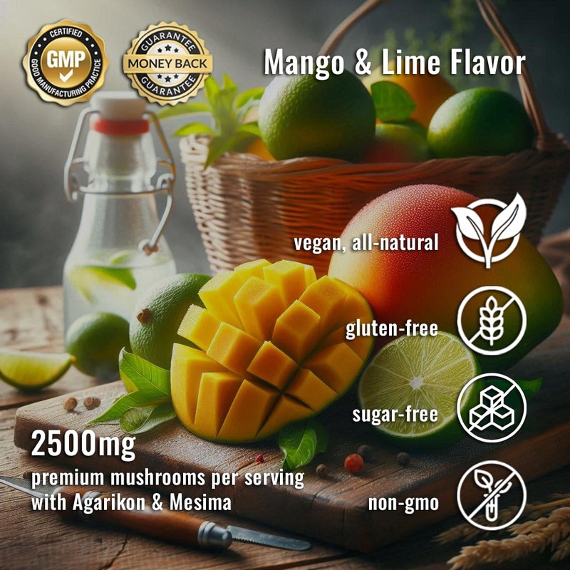 Mushroom Gummies Nootropic Adaptogenic with Agarikon, Mango & Lime Flavor, Vegan, Gluten-Free, Sugar-Free, Non-GMO, 10x Mushrooms, Focus, Energy, Mental Clarity, Lion's Mane, Reishi, Chaga