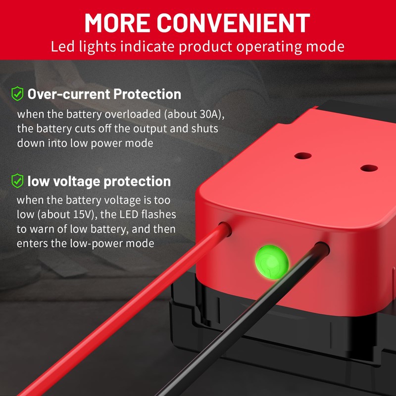 • Convenient Switch with Indicator: The power wheel battery adapter features an integrated push-button switch and LED indicator for convenience and safety. The LED light shows the product's operating mode. If the battery enters low-power mode due to overcurrent or low voltage, the LED will flash, alerting to the current state of the battery