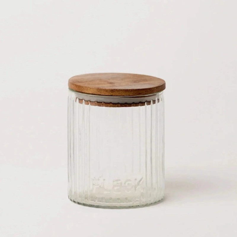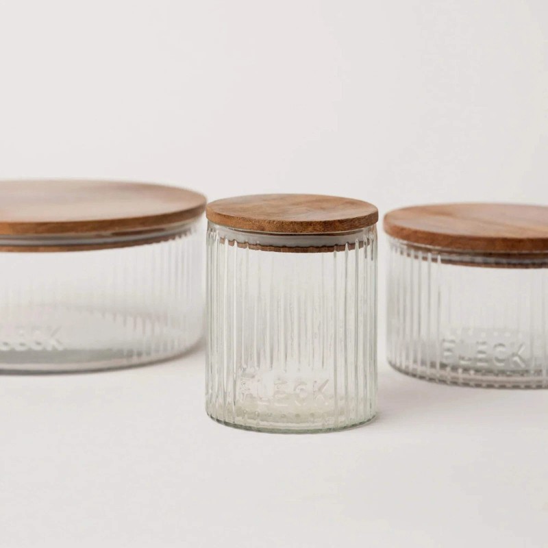 Maker: Fleck Need a jar that's practical & pretty? Our fluted glass jars are just the right fit. Organize your everyday essentials like tea, coffee snacks or spices. Ergonomically shaped, these fluted glass jar sits well in your cabinet or on a display shelf. Our suggestion is to use the small ones for organising the spice racks, medium ones for storing nuts on a display & the large ones for cookies, snacks etc. Comes with a wood lid with a silicone seal. Dimensions(D x H): Small: 7 x 8 cms / 2.8" x 3.15" Medium: 10 x 6.5 cms / 4" x 2.5" Large: 15 x 6.6 cms / 6" x 2.6" Material: Glass & Wood Notes: While they come with a silicone seal but with glass being hand blown they are not 100% airtight.Fluted Glass Storage Jars - set of 3