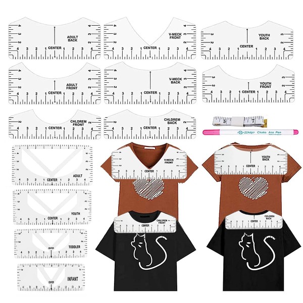 - 【Value Tshirt Ruler Set】Our 14 piece t-shirt guide package contains 8 different sized shirt rulers, 4pcs transparent v-neck t-shirt aligner tools, 1pcs soft measuring tape, 1pcs sewing mark pencil. Different sizes for baby, child, youth, adult. It can be used to meet the measuring needs of different sizes of clothes during the sewing process.