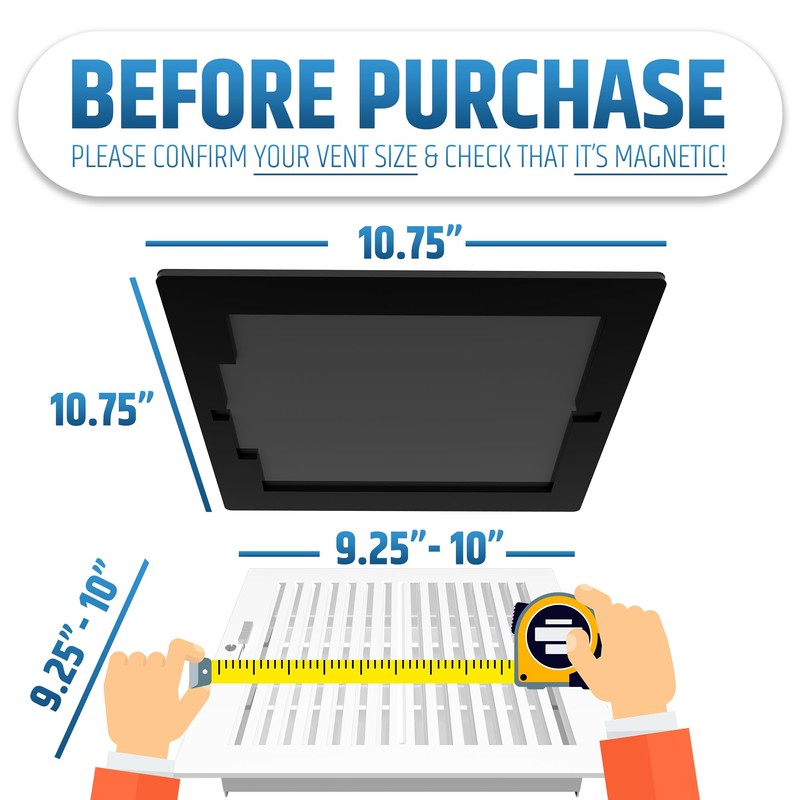 - 📏 PLEASE CONFIRM YOUR VENT SIZE & CHECK MAGNETISM - Unlike other flimsy one-size-fit all magnetic vent covers, we have created a unique cover design for each vent size. Each cover is designed with a different backside pocket feature and specific locations of hidden magnets. First, check that your vent is magnetic. Second, this cover WILL ONLY work on vents with a width between the range of 9.25” to 10” and length between the range of 9.25” to 10”.