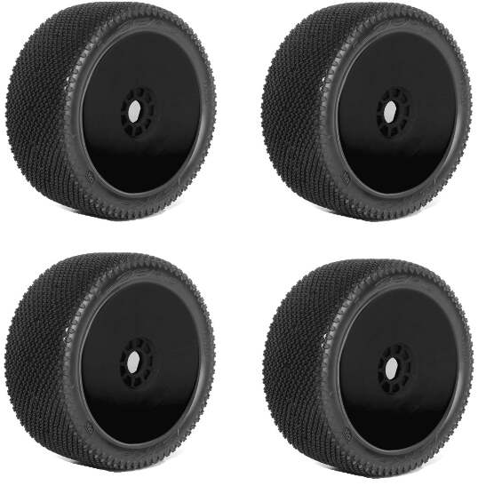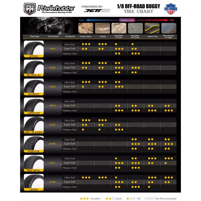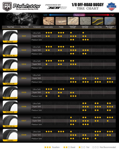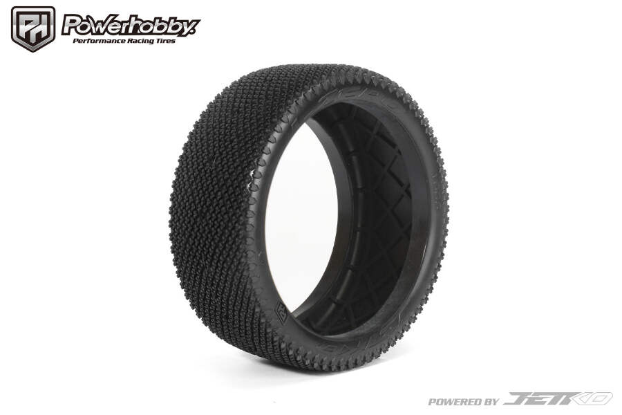 Powerhobby J-Zero 1/8 Buggy Tires Black Dish Wheels (4) Ultra Soft Unglued Powered by Jetkoengineers looked at the best of the best and analyzed how the most efficient tires performed on low grip tracks. It soon became apparent that the challenge was to achieve an extremely flexible tread by creating numerous deformation zones and avoiding designs that offered too much stiffness.At the same time, the sidewalls were redesigned to achieve controlled flex. This means that the lugs are slit to ensure that they do not interfere with the deformation of the carcass, and spaced areas multiply the deformation zones.The internal structure of the tires is also new to prevent centrifugal force deforming the contact patch, improving tires consistency. Design looks alike the most efficient tires on these surfaces, with a sculpted sidewall, wide side blocks that contribute to precision, split diamond lugs and diamond lug blocks.The J-Zero will be perfect on wet tracks with cold wet rubber or dry tracks on low grip with traditional rubber.Includes : 4 Tires 4 Foam Inserts 4 Wheels Specs: Width 44.2mm Height 109.6mm