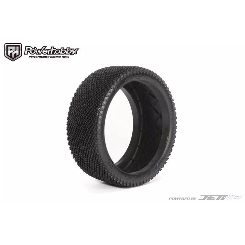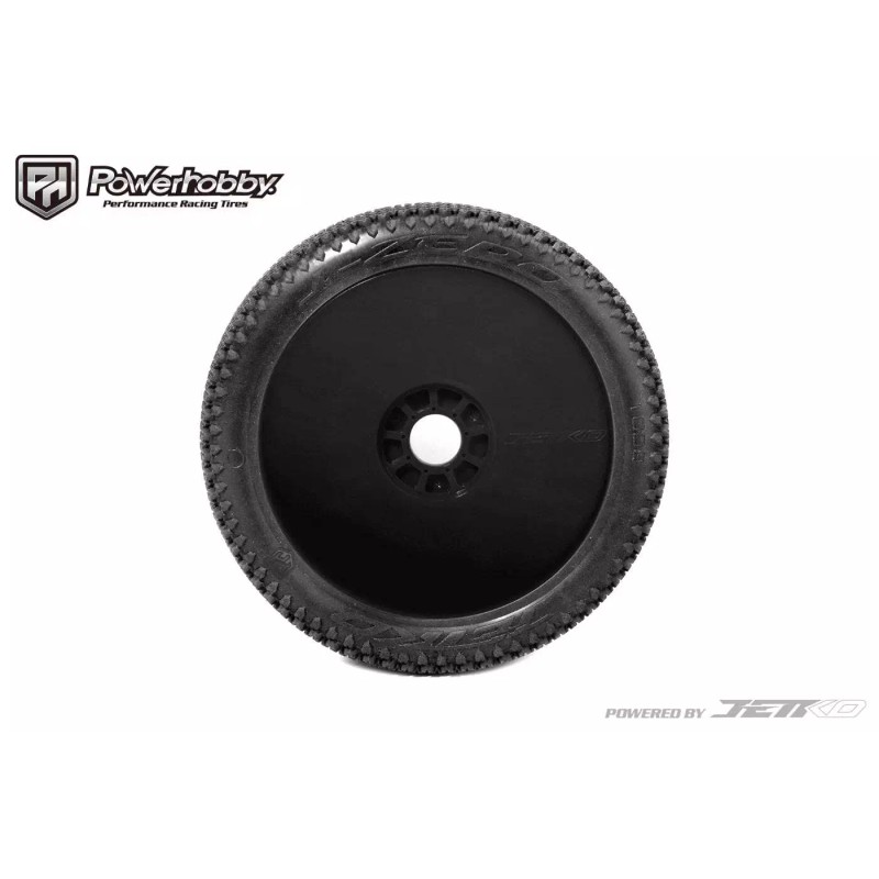 Powerhobby J-Zero 1/8 Buggy Tires Black Dish Wheels (4) Ultra Soft Unglued Powered by Jetkoengineers looked at the best of the best and analyzed how the most efficient tires performed on low grip tracks. It soon became apparent that the challenge was to achieve an extremely flexible tread by creating numerous deformation zones and avoiding designs that offered too much stiffness.At the same time, the sidewalls were redesigned to achieve controlled flex. This means that the lugs are slit to ensure that they do not interfere with the deformation of the carcass, and spaced areas multiply the deformation zones.The internal structure of the tires is also new to prevent centrifugal force deforming the contact patch, improving tires consistency. Design looks alike the most efficient tires on these surfaces, with a sculpted sidewall, wide side blocks that contribute to precision, split diamond lugs and diamond lug blocks.The J-Zero will be perfect on wet tracks with cold wet rubber or dry tracks on low grip with traditional rubber.Includes : 4 Tires 4 Foam Inserts 4 Wheels Specs: Width 44.2mm Height 109.6mmPowerhobby J-Zero 1/8 Buggy Tires Black Dish Wheels (4) Ultra Soft Unglued