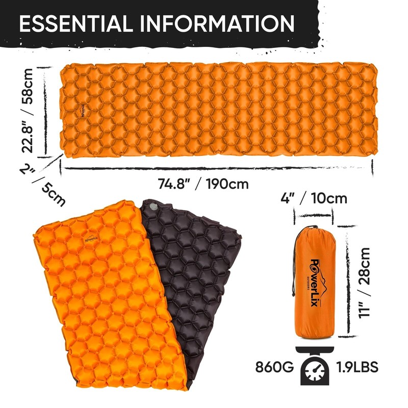 POWERLIX Ultralight Inflatable Camping Sleeping Pad - Compact and Lightweight Inflating Mat - Portable and Comfortable Air Mattress for Backpacking, Traveling and Hiking - Orange