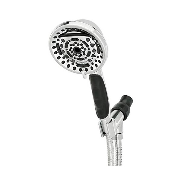 - 4.5-in spray face Waterfall setting Non-slip rubber grip 9 Spray patterns Includes a 72-in stainless steel hose Non-stick internal parts prevent clogging and corrosion Comfort control lever quickly adjusts shower pressure Max Flow Rate: 2.0 GPM