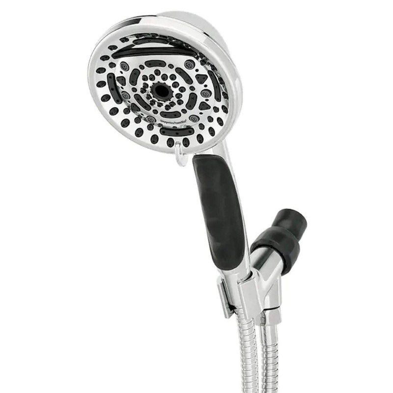 - 4.5-in spray face Waterfall setting Non-slip rubber grip 9 Spray patterns Includes a 72-in stainless steel hose Non-stick internal parts prevent clogging and corrosion Comfort control lever quickly adjusts shower pressure Max Flow Rate: 2.0 GPM