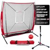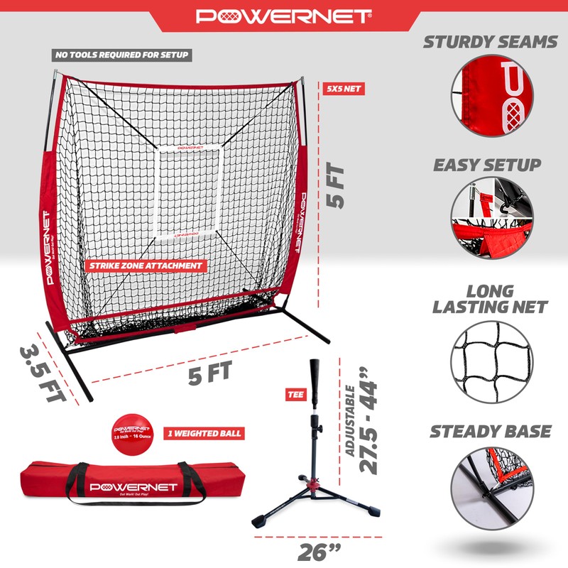 PowerNet Baseball Bundle, 5x5 FT Hitting and Pitching Net with Batting Tee, Softball & Baseball Training Equipment, Weighted Ball & Bag (Red Net & Tee)