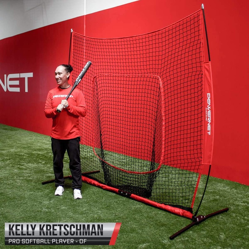 - 7'x7' PRO NET (One Piece Frame); Instant portable baseball & softball net; Weighted steel base with sturdy square legs increase stability; Includes 7ft x 7ft (49 SqFt) net, 1 carry bag with shoulder strap and ground stakes