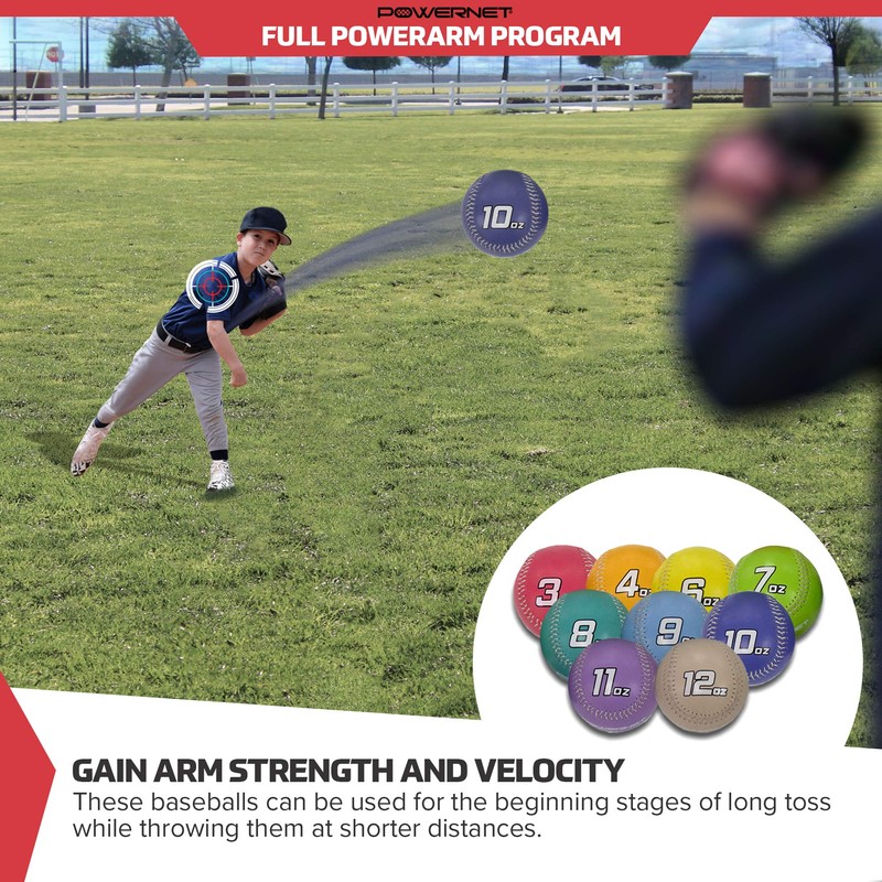 • GAIN ARM STRENGTH AND VELOCITY - Introducing this set of 9 weighted balls from 3-12 oz. This set will help guide your player into building arm strength and velocity. These baseballs can be used for the beginning stages of long toss while throwing them at shorter distances.