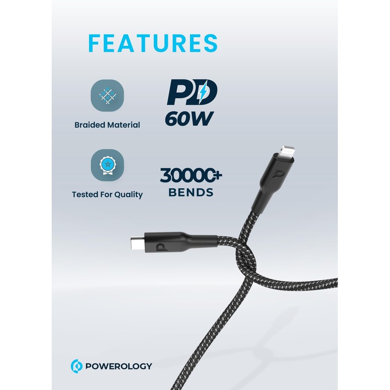 Powerology MFI Braided Type-C toh Lightning Head Cable 30CM - Data & Fast Charge - Braided Material - 30000+ Bends - 60W PD - Black