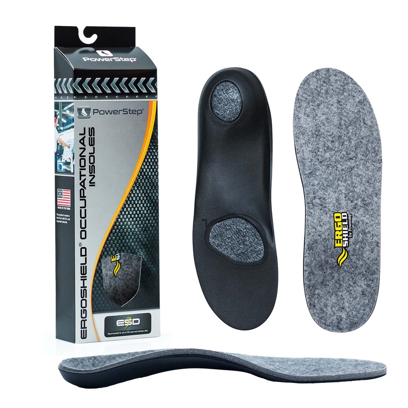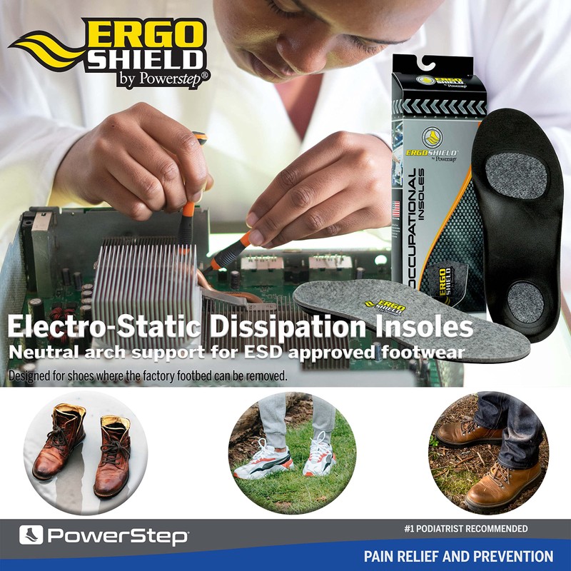 - ⚡ DESIGNED SPECIFICALLY FOR YOUR ESD APPROVED FOOTWEAR: The PowerStep ErgoShield ESD insoles were specifically designed to provide full contact electro-static dissipation (ESD). The cut outs at the ball of foot and heel of these insoles allow the conductive fibers in the material to transfer statitc electricity through the body to the shoe and ground.