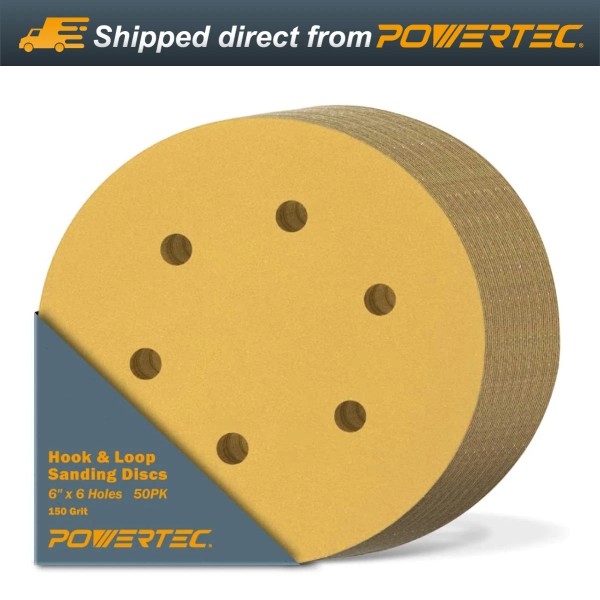 POWERTEC 45215G-50 Gold 6" Hook and Loop Sanding Disc, 6 Hole, 150 Grit, 50 PK