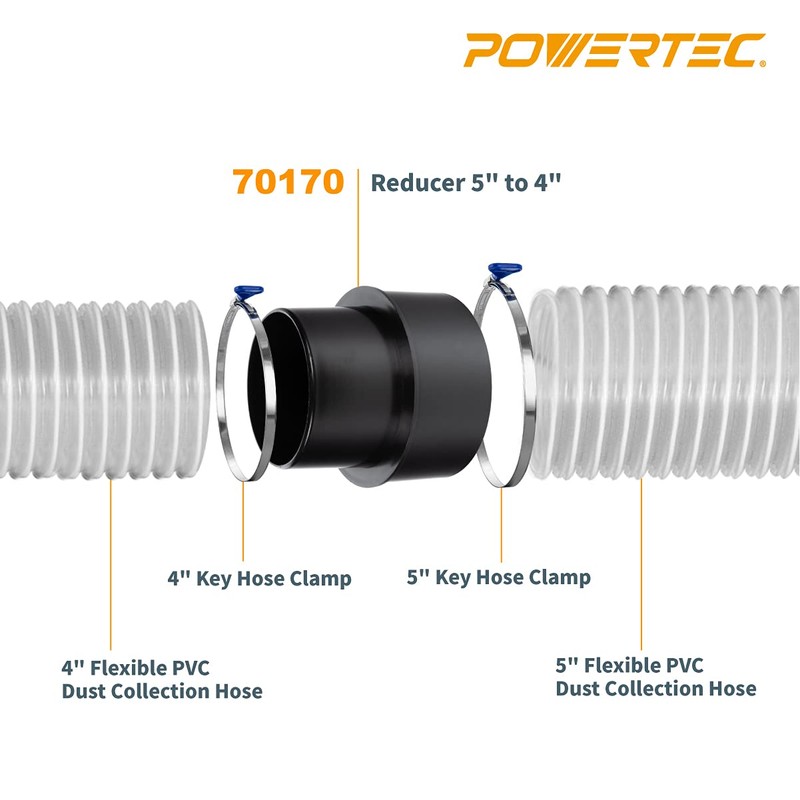 POWERTEC 5" x 10' Dust Collection Hose with 5pcs Stainless Steel Clamps and 5" to 4" Reducer for Woodworking, Wood Shop Dust Collection System, Leaf Vacuum, Lawn Mower, Ferrets and Small Pets (70465)
