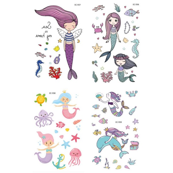 PowerTRC Temporary Tattoos Mermaid Cartoon For Kids, 12 Sheets Set, With 4 Unique Sheet Styles, Easy To Apply And Remove Fake Tattoos, Birthday Party Supplies, Ocean Theme For Boys And Girls