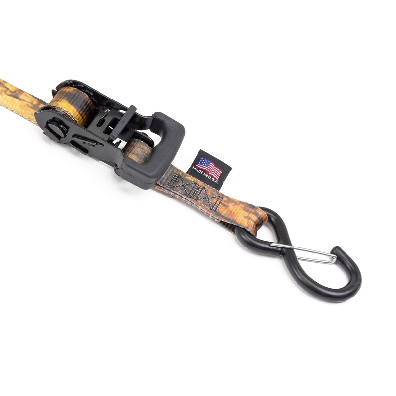 PowerTye 1in x 15ft Black Ratchet Tie-Downs with Latch Hooks, Soft-Tyes, and Storage Bag - Made in USA - 600 lb. Working Load Limit / 1,800 lb. Breaking Strength - Fall Forest CAMO (Pair)