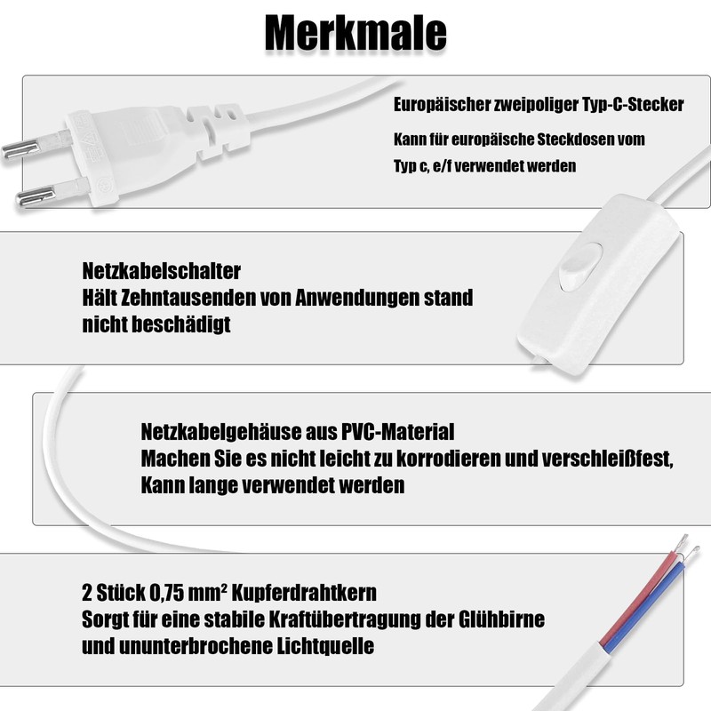 - Robust and durable: This power cable with plug is made of a PVC material jacket and a copper core. Thanks to the PVC material shell, the lamp holder with cable is not easy to corrode and wear-resistant. The copper wire core ensures stable power transmission and an uninterrupted light source of the bulb.