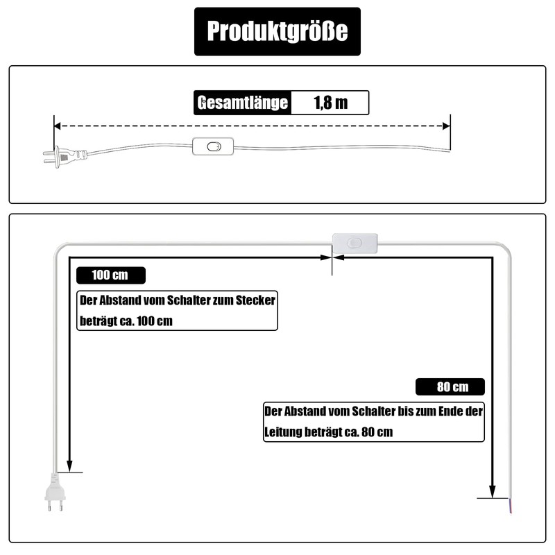 - Cable with plug: When purchasing this product, you will receive 3 white cables with switch and plug. The product length is 1.8m, the rated voltage is 230V and the maximum lamp power is 100W.