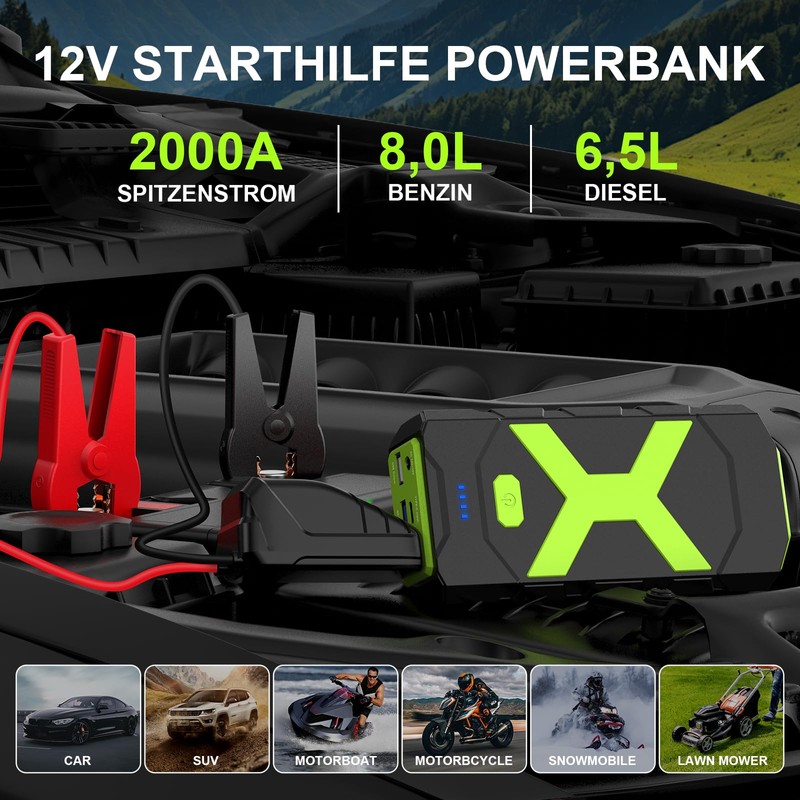 - 2000 A jump starter power bank: the 74WH portable car jump starter power bank can safely start a low battery in seconds. This compact car starter is a powerful car starter that delivers 2000 A peak current and is suitable for petrol engines up to 8.0 L and diesel engines up to 6.5 L and it can be used a maximum of 40 times after it has been fully charged. Can work at -20ºC~65ºC for trucks, cars, garden tractors, riding mowers, motorcycles, RVs, vans, SUVs, watercraft, yachts, etc.