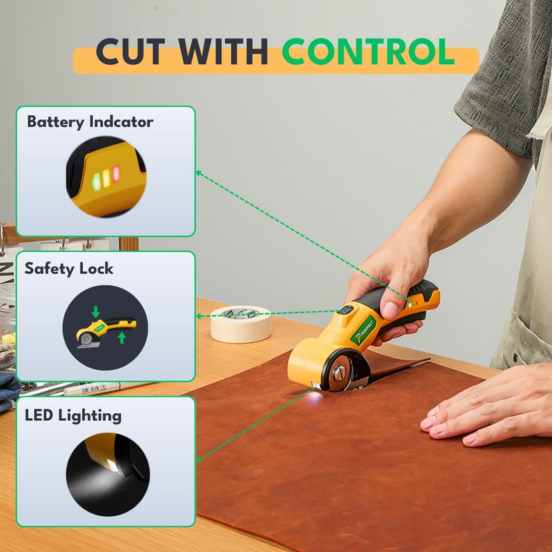 - (FLEXIBLE FOR FABRIC & MORE): This electric scissors for fabric also cuts carpet, denim, leather, and more. The rotary blade ensures clean, smooth cuts on soft, flexible materials.