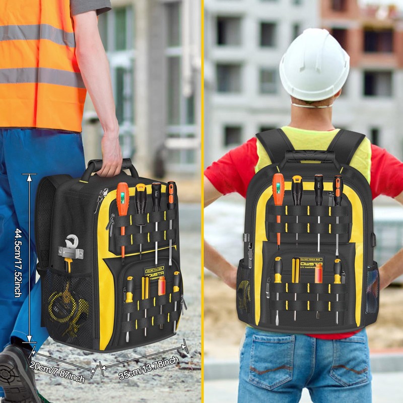 - 【Super Large Storage Capacity】: The Tool backpack dimensions are 13.78"x 7.87" x 17.52". It features a large double-zipper opening, allowing a clear view of the tools stored inside when fully opened, which facilitates organization. There are multiple straps on the outer side, which can fix various tools such as screwdrivers and pliers in corresponding positions for quick access.