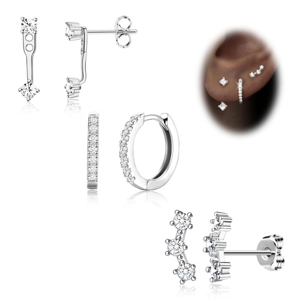 Poxtex Silver Earrings for Women, 925 Sterling Silver Hypoallergenic Earrings Set for Multiple Piercing, Hoop Jacket Studs Earrings Silver Trendy Jewelry Gifts