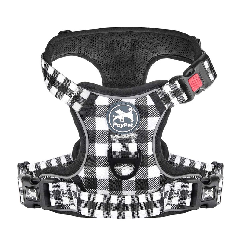 PoyPet No Pull Dog Harness, [Neck Release] Reflective Adjustable No Choke Pet Vest with Front & Back 2 Leash Attachments, Soft Control Training Handle for Small Dogs(Grid,M)