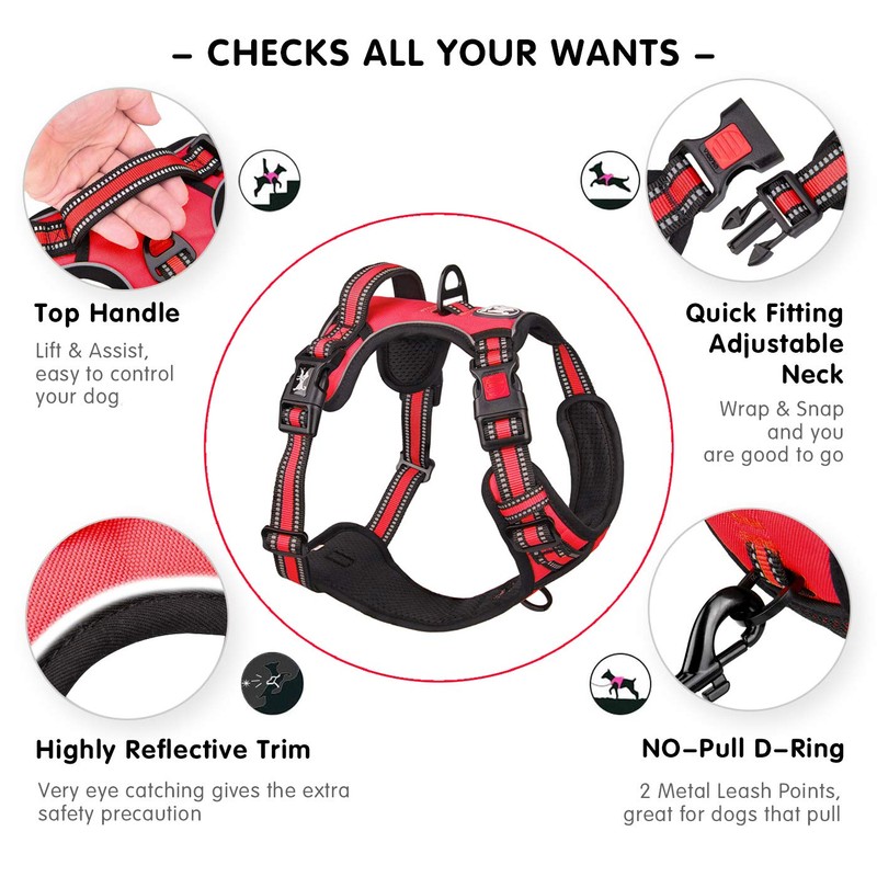- NO PULL AND CHOKE-FREE: Our non-pulling dog harness has 2 sturdy metal leash points, front clip for discouraging pulling and back for relaxed walks. It's soft breathable non-toxic air mesh padded, pulling pressure is evenly distributed to the body to prevent Choking. This easy walk dog harness is perfect for daily walking, running, hiking, training, hunting, outdoor adventure and more!
