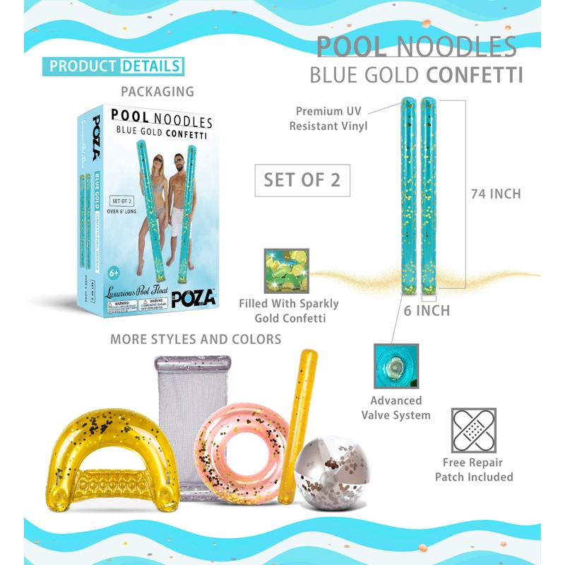 - INCLUDED WITH THE PURCHASE OF INFLATABLE BLUE GOLD SWIMMING POOL NOODLES - Includes 2 Pack of POZA Inflatable Jumbo Noodles for Swimming Pools. Noodles Pool Floaties filled with sparkling gold confetti. Using an electric air pump the large pool noodles' advanced quick air valve system allows for easy inflation or deflation. Each swimming noodle pool comes with a repair patch and measures 74x6x6 inches. Each pool floaty is ideal for kids 6 and up.